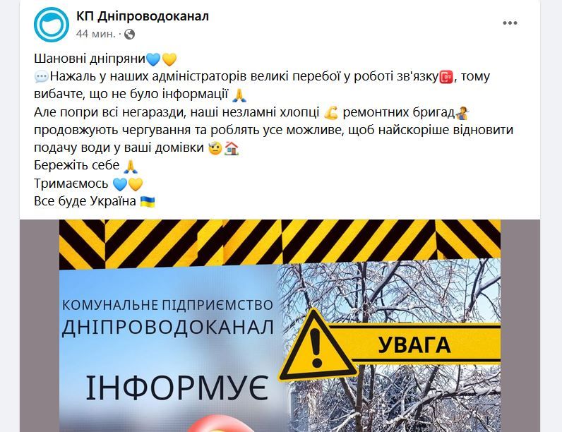 Як повідомили на сторінці КП "Дніпроводоканал", у адміністраторів, які відповідають за інформування про відновлення водопостачання наразі проблеми зі зв'язком. Зазначається, що ремонтні бригади на місцях та роблять все можливе, щоб відновити подачу води дніпрянам.