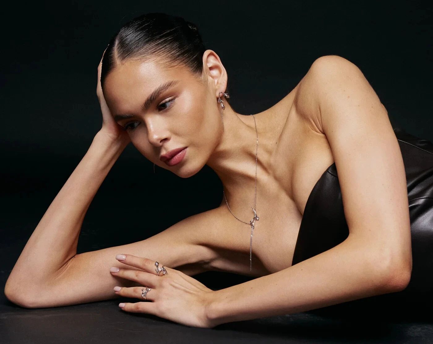 Чорний колір поглинає світло, і саме тому важливо, яке воно повертає. Гладко поліроване срібло дає чіткий блиск і виглядає графічно. Матове — навпаки, м’яке, тепле, майже камерне. Браслет-манжет додає строгості й характеру, а тонкий ланцюговий браслет — легкості. Ці нюанси змінюють відчуття від сукні сильніше, ніж здається.