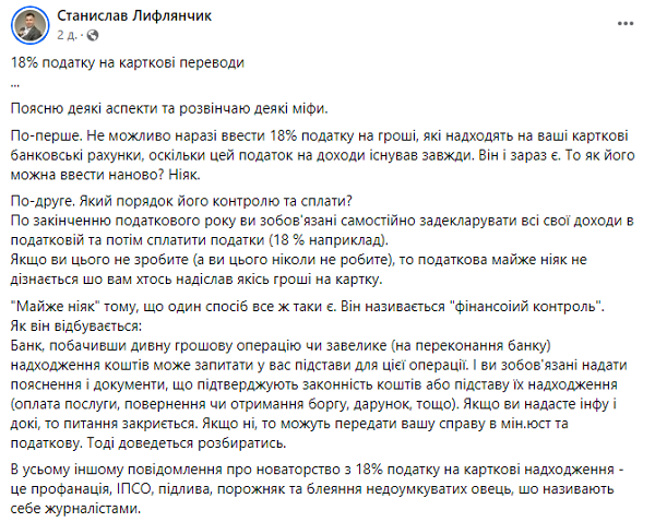 «Неможливо запровадити 18% податку на гроші, які надходять на ваші карткові банківські рахунки, оскільки цей податок на доходи існував завжди. Він і зараз є. То як його можна ввести заново? Ніяк», - наголосив адвокат Станіслав Ліфлянчик. Він зазначив, що громадянин після закінчення податкового року має самостійно задекларувати свої доходи і потім сплатити податки. «Якщо ви цього не зробите (а ви цього ніколи не робите), то податкова майже ніяк не може дізнатися хто вам надіслав якусь суму грошей на картку». – сказав адвокат.