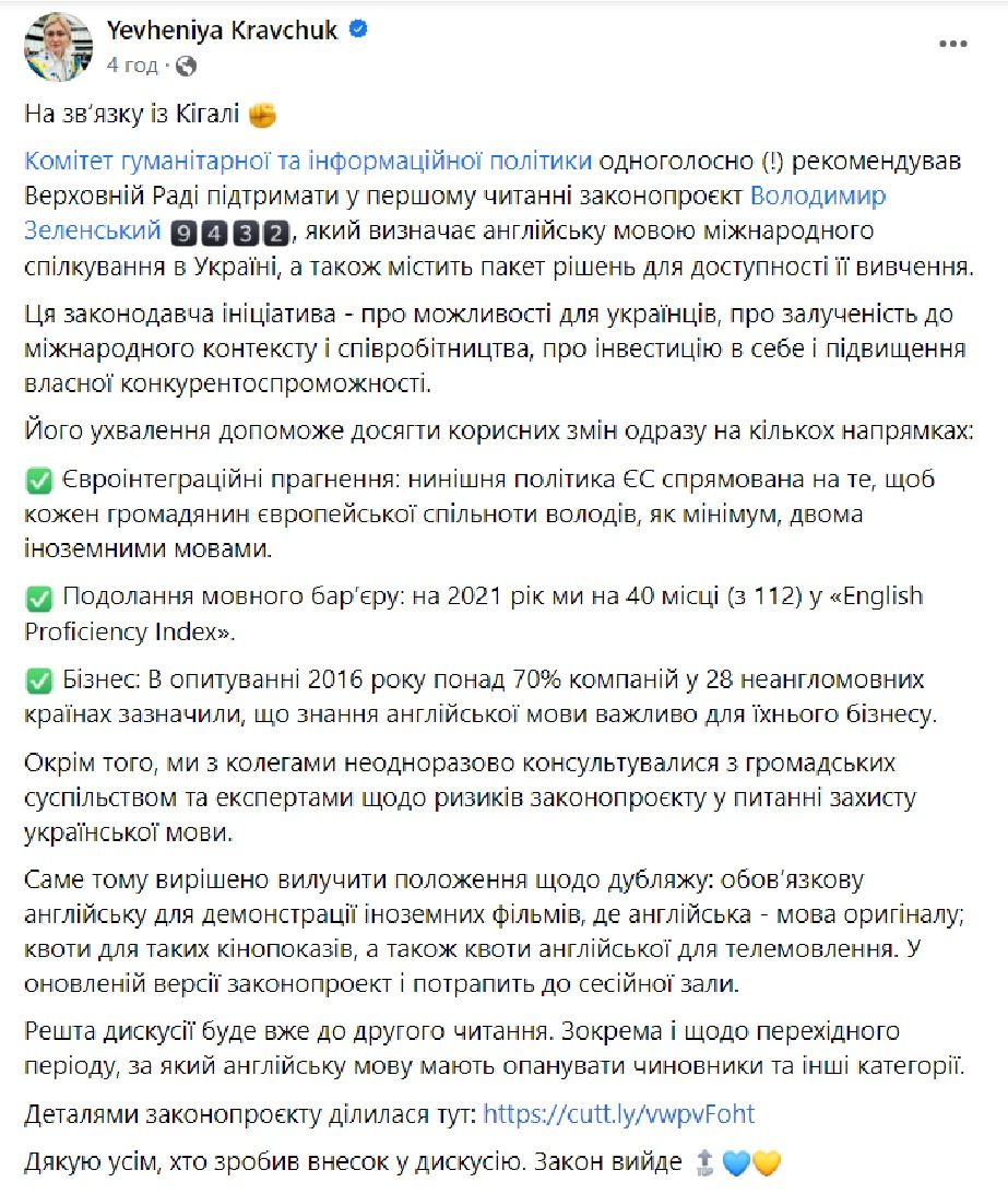 Ми з колегами неодноразово консультувалися з громадських суспільством та експертами щодо ризиків законопроєкту у питанні захисту української мови. Саме тому вирішено вилучити положення щодо дубляжу: обов’язкову англійську для демонстрації іноземних фільмів, де англійська - мова оригіналу; квоти для таких кінопоказів, а також квоти англійської для телемовлення. У оновленій версії законопроєкт і потрапить до сесійної зали. Решта дискусії буде вже до другого читання, – повідомила Кравчук.