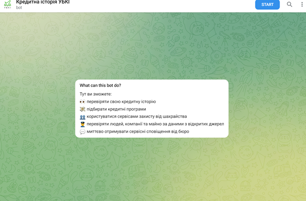 За допомогою бота Українського Бюро Кредитних Історій користувач може перевірити свою кредитну історію та кредитний рейтинг (він впливає на те, наскільки охоче банки даватимуть у майбутньому кредит), але також вибрати кредитора та подати заявку на отримання грошей.