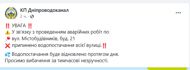 Так, у зв’язку із проведенням аварійних робіт на вул. Містобудівників, 21 припинено водопостачання всієї вулиці.