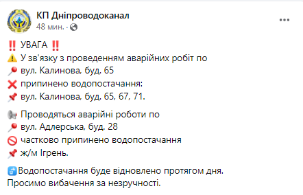 Так, у зв'язку із проведенням аварійних робіт на вул. Калиновій, 65 та вул. Адлерській, 28 припинено водопостачання: