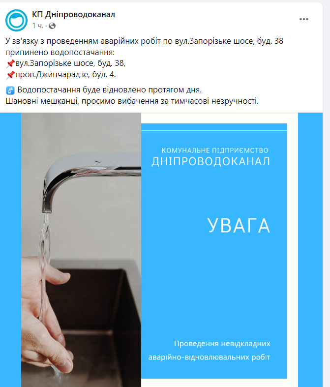 Так, у зв'язку з проведенням аварійних робіт на вул. Запорізьке шосе, 38 припинено водопостачання: