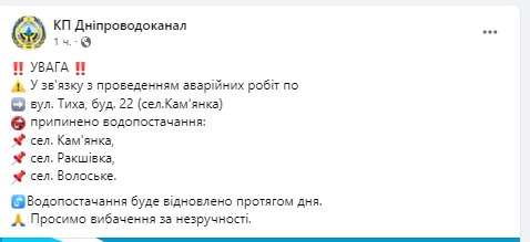 Крім того, аварійні роботи проводять на вул. Тихій, 22 (сел. Кам'янка). Тому припинено водопостачання: