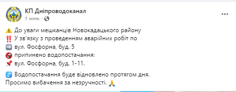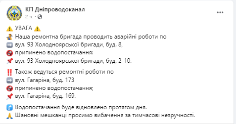 Так, у зв'язку із проведенням аварійних робіт на вул. 93-ї Холодноярської бригади, 8; вул. Гагаріна, 173 та вул. Фосфорній, 5 припинено водопостачання: