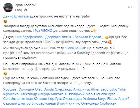 Ми звернулися до очільниці комітету Олени Шуляк ще в лютому, аби профільний комітет поговорив з очільником Кабміну і допоміг пофіксити цю помилкову політику. Наш лист направили Шмигалю, Шмигаль на МВС, МВС знов на Шмигаля. Коловорот паперу в природі. А результатів - 0, - зазначила Ірина Федорів.
