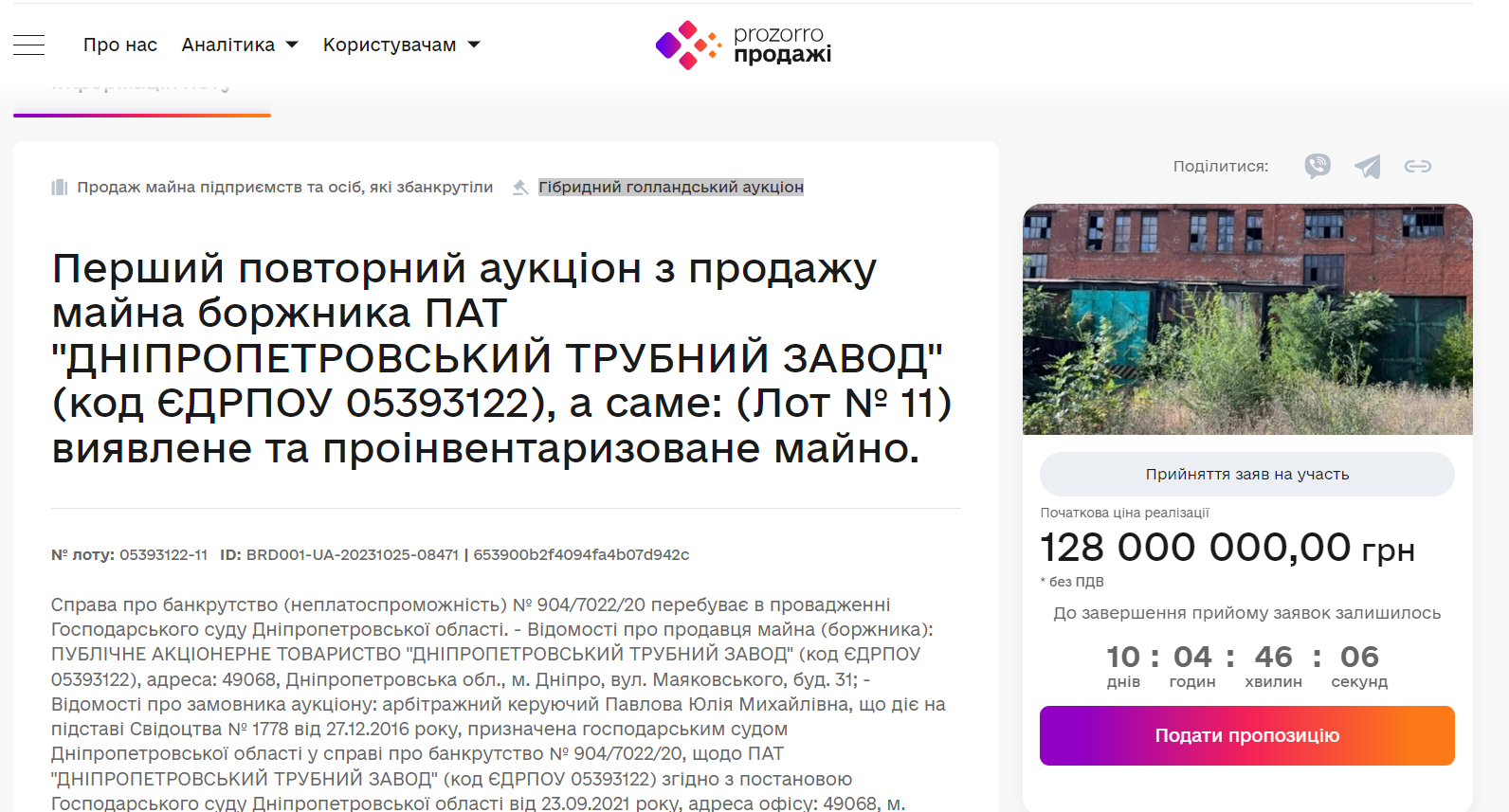 На онлайн-аукціон повторно виставили ПАТ «Дніпропетровський трубний завод» - ціну знизили на 32 млн грн (було 160 млн грн, а стало - 128 млн грн).