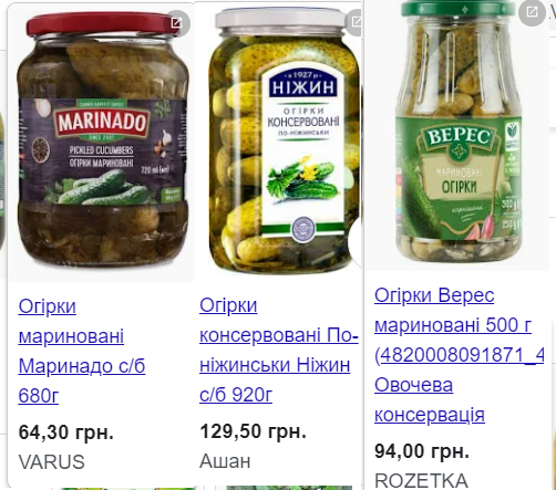 Це в рази дешевше ніж минулорічні консервовані. Наприклад, у "Варусі" за 680 г маринованих огірків доведеться заплатити 64,30 грн, у "Розетці" за 500 г маринованих огірків просять 94 грн. А за майже кілограм консервованих огірків в "Ашані" треба віддати аж 129,50 грн.