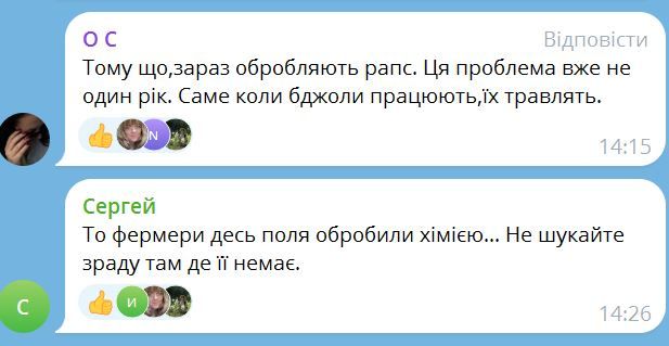 У коментарях до допису люди закликали не шукати "зраду". Вони вважають, що загибель джмелів може бути цілком природною, позаяк самці цього виду живуть не більше двох тижнів. Цьогоріч всі процеси в природі "здвинулися" на півмісяця раніше, і тому комахи вже почали відмирати.