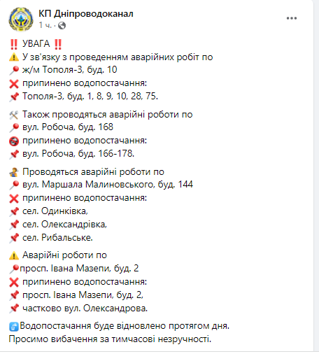 Так, у зв'язку з проведенням аварійних робіт на ж/м Тополя-3, 10; вул. Робочій, 168; просп. Івана Мазепи, 2 припинено водопостачання: