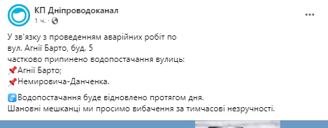 Так, у зв'язку з проведенням аварійних робіт на вул. Агнії Барто, 5 частково припинено водопостачання: