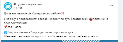 Крім того, у зв'язку з проведенням аварійних робіт на вул. Богатирській припинено водопостачання: