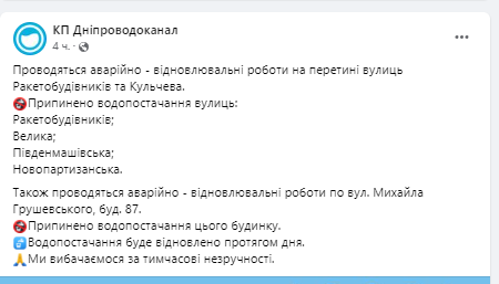 Так, у зв'язку з проведенням аварійних робіт на вул. Ракетобудівників; вул. Кульчева; вул. Михайла Грушевського, 87; вул. Вітчизняна, 93; вул. Робоча, 154 припинено водопостачання:
