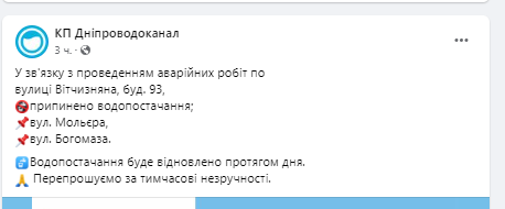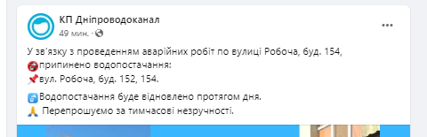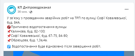 Крім того, у зв'язку з проведенням аварійних робіт на ТРП на вулиці Софії Ковалевської, 84А припинено водопостачання вулиць: