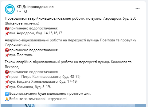 Так, у зв'язку із проведенням аварійно-відновлювальних робіт на вулиці Аеродром (військове містечко); на перехресті вул. Повітова та пров. Сорочинський; на перехресті вул. Калинова та Яскрава припинено водопостачання: