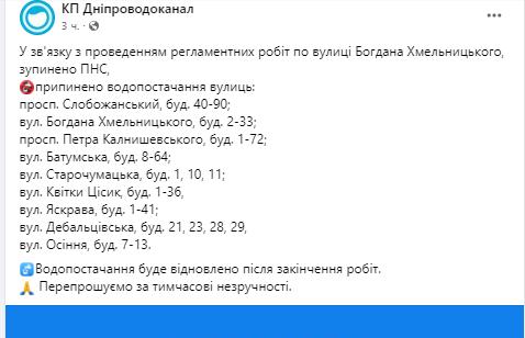 Крім того, у зв'язку з проведенням регламентних робіт на вулиці Богдана Хмельницького зупинено ПНС. Тому припинено водопостачання: