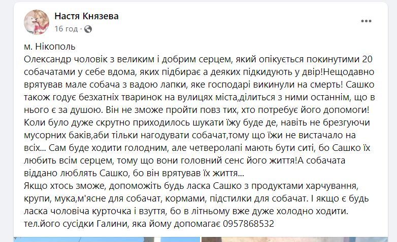 Пан Олександр живе у Нікополі. Попри те, що місто постійно обстрілюють, дідусь навіть не думає кудись виїжджати, адже опікується кількома десятками знедолених собак. Наразі з ним живе 20 тварин, яких покинули господарі. За словами волонтерки, яка вирішила розповісти історію чоловіка, частину тварин Олександр врятував самотужки, а частину йому підкинули у двір.