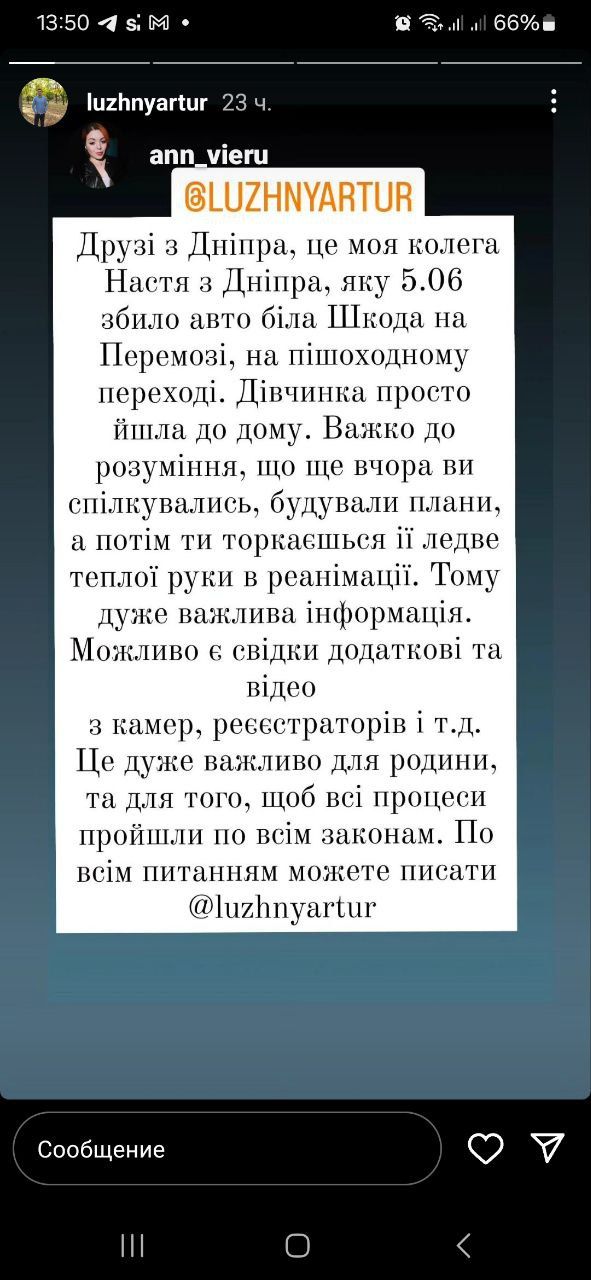 Друзі з Дніпра, це моя колега Настя з Дніпра, яку 5.06 збило авто біля Шкода на Перемозі, на пішоходному на переході. Дівчинка просто йшла до дому. Важко до розуміння, що ще вчора ви спілкувались, будували плани, а потім ти торкаєшся її ледь теплої руки у реанімації. Можливо є свідки додаткові та відео з камер, реєстраторів і.т.д. Це дуже важливо для родини, щоб усі процеси пройшли по всім законам. По всім питанням можете писати @luzhnyartur, - сказано у повідомленні.