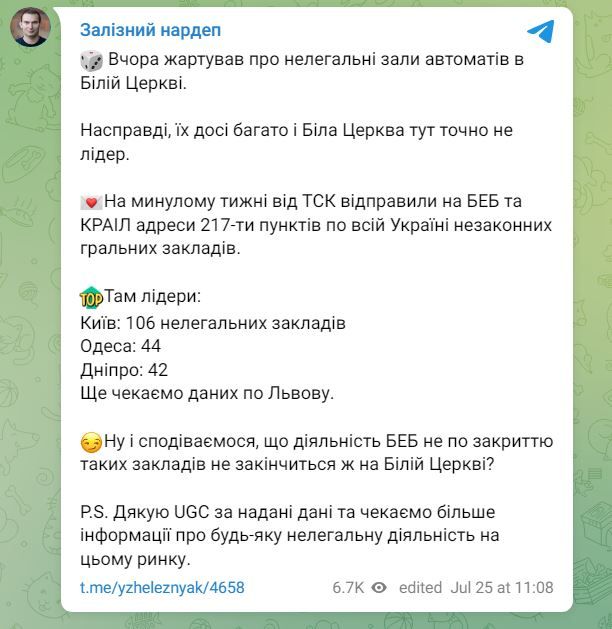 На минулому тижні від ТСК відправили на БЕБ та КРАІЛ адреси 217-ти пунктів по всій Україні незаконних гральних закладів, - розповів нардеп.
