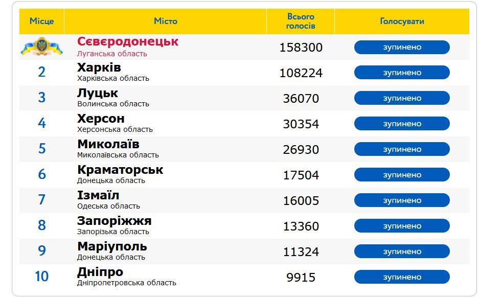 Переможцем став - Сєверодонецьк, за нього проголосували 158,3 тисячі разів. Наразі місто тимчасово окуповане. До рейтингу увійшли Луцьк, Харків, Херсон, Миколаїв.