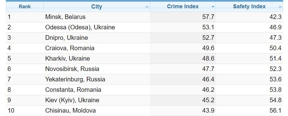 Крім цього, Дніпро у ТОП-5 найкримінальніших міст Східної Європи. На першому місці білоруський Мінськ, на другому Одеса і замикає трійку Дніпро.