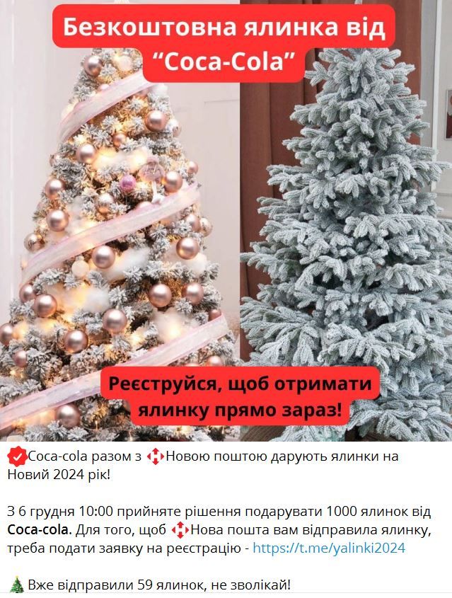 Днями у вайбері та телеграмі почали з'являтися повідомлення про розіграші від "Нової пошти" та "Coca-Cola". У тексті дописів йдеться про те, що за реєстрацію ці компанії обіцяють подарувати святкову ялинку, а 59 людей нібито вже отримали свій приз.