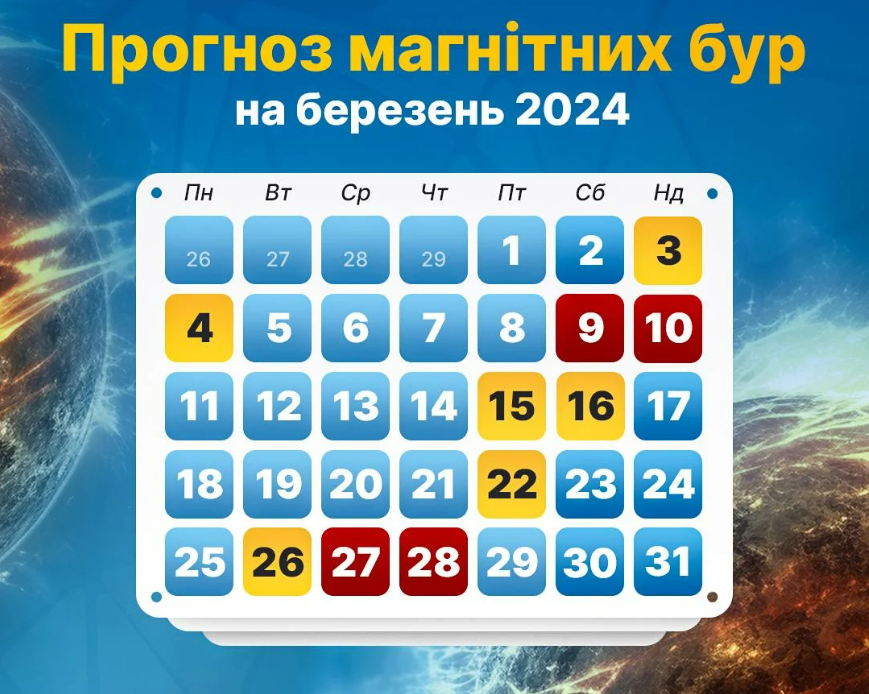 Протягом місяця сумарно очікується 10 небезпечних днів. Перша магнітна буря в березні триватиме 3-4 числа і буде слабкою за потужністю. Потім сильна магнітна буря прогнозується 9-10 березня. Наступну підвищену сонячну активність варто чекати 15-16 березня. Одноденна слабка магнітна буря буде 22 березня. Остання в березні буря прогнозується 26-28 березня - активність Сонця в перший день буде слабкою, а потім посилиться.