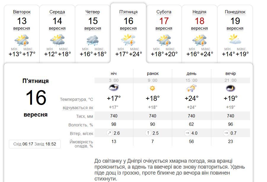 Так, у Дніпро повернеться літо, щоправда тепло прийде з дощами. Уже завтра температура повітря прогріється до +18 градусів. А в п'ятницю вдень буде +24 градуси тепла.