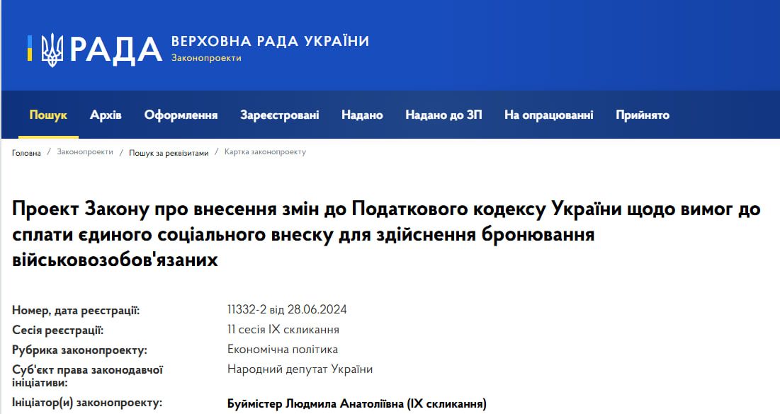 Перший законопроєкт - про внесення змін до Податкового кодексу України щодо вимог до сплати єдиного соціального внеску для здійснення бронювання військовозобов'язаних - опублікований 28 червня. Передбачає в основному:
