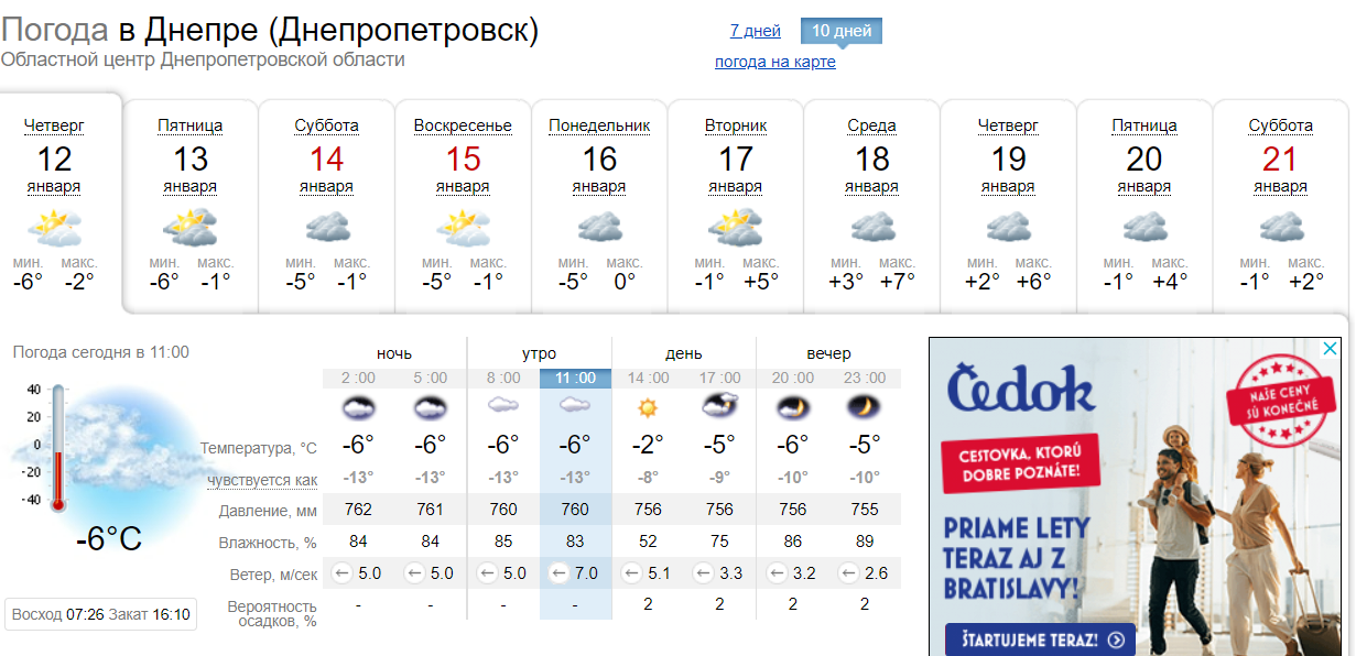 Так, як повідомляється на сайті прогнозу погоди, з наступного тижня у Дніпрі знову буде плюсова температура. Наприклад, у понеділок, 16 січня, ще буде морозно - до мінус п'яти градусів, а вже у вівторок, 17 січня, прогнозують плюс п'ять градусів вдень та мінус один - вночі. Інші дні тижня теж поки без істотних морозів вночі, а от вдень температура сягне плюс семи градусів.