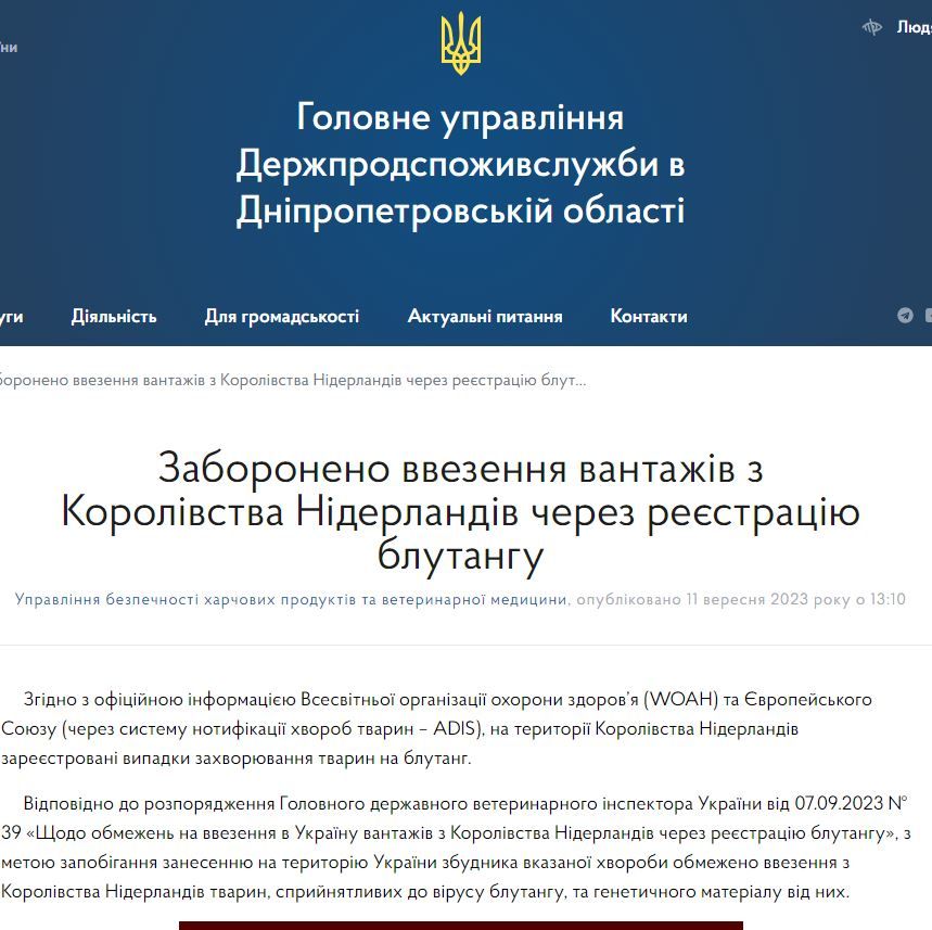 Причина - реєстрація у Королівстві Нідерландів блутангу. Тож заборонено ввозити тварин, які можуть бути сприйнятливі до цього вірусу.