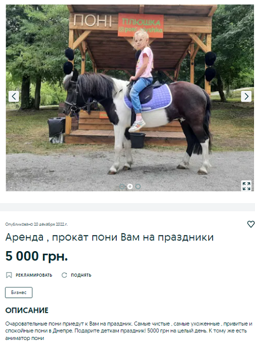 Оренда поні на цілий день коштуватиме 5 тис грн. Власник тварини зазначає, що маленькі конячки: «доглянуті, чисті, щеплені та спокійні». Разом з поні можна оплатити і роботу аніматора, який доглядатиме за ними.