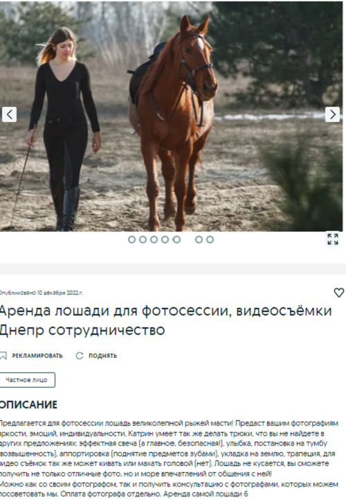 Година оренди коня у Дніпрі коштуватиме 600 грн. Передбачається, що тварина братиме участь у фотосесії чи відеозйомці. Орендодавець зазначає, що: «кінь вміє робити трюки», а вся фотосесія буде відбуватися у звичному для тваринного місці, везти її ніхто нікуди не буде.
