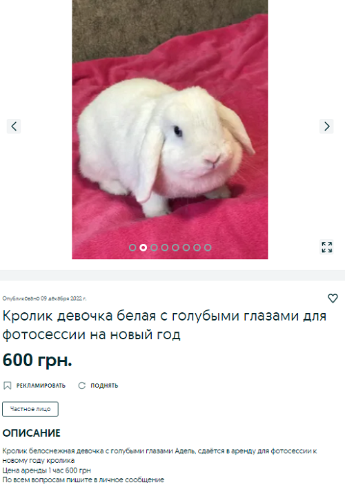 Аналогічно за вартістю коштуватиме оренда білого з блакитними очима кролика. Пухнастого звіра також здають в оренду для фотосесій із дітьми.