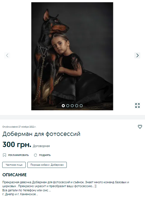 Взяти в оренду для проведення фотосесій у Дніпрі можна й добермана. Як стверджує господар, собака знає багато базових та циркових команд. Вартість години прокату – 300 грн.