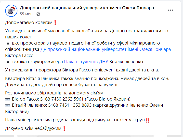 Також стало відомо, що через ракетні удари пошкоджено житло співробітників Дніпровського національного університету - в.о. проректора з науково-педагогічної роботи Віктора Гассо, а також техніка і звукорежисера Палацу студентів ДНУ Віталія Ільченко.