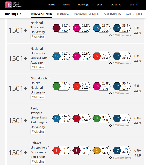 Два ВНЗ Дніпра потрапили до всесвітнього рейтингу університетів Impact Rankings.