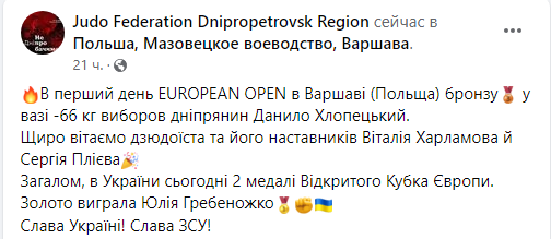 Дніпрянин Данило Хлопецький став бронзовим призером на Кубку Європи у польській Варшаві. Про це повідомляється на сторінці Федерації дзюдо Дніпропетровської області у Facebook. Медаль спортсмен виборов у ваговій категорії до 66 кг.