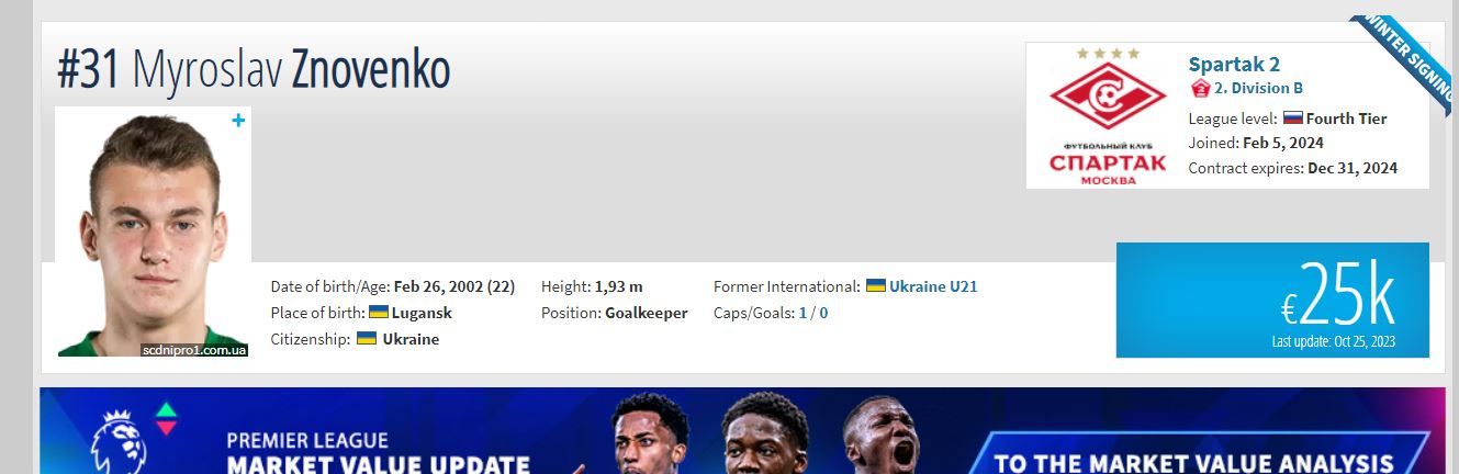 22-річний Мирослав Зновенко поїхав на заробітки до Москви, аби грати за місцевий футбольний клуб "Спартак". Ексворотар "Дніпра" перейшов до російської команди 5 лютого 2024, йдеться на порталі Transfermarkt.