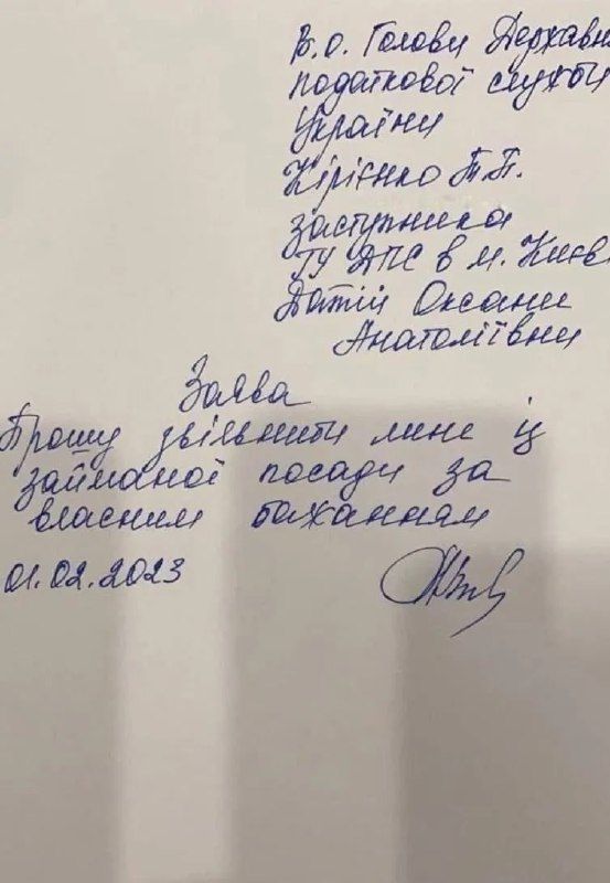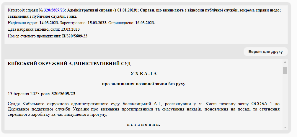 6 лютого Датій звільнили офіційно - через наказ. 9 лютого його оголосили. А вже через місяць, 9 березня, ексочільниця ДПС подала до суду. Вона вимагає скасувати звільнення, поновити її на держслужбі та виплатити компенсацію заробітку за «вимушений прогул».