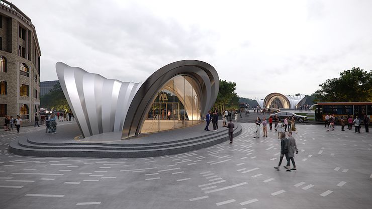 "Театральна" розташована поруч із Дніпровським академічним театром опери та балету, що й визначило її назву. Ось так у майбутньому може виглядати ця станція (візуалізація, яку розробило архітектурне бюро Zaha Hadid Architects):