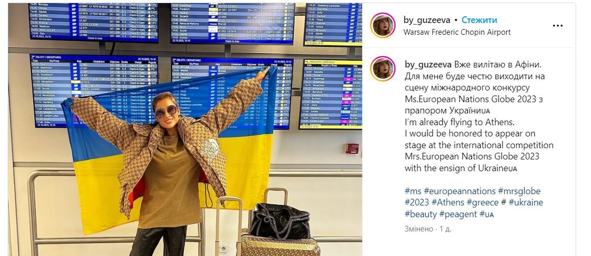 “Я вже вилітаю в Афіни. Для мене буде честю виходити на сцену міжнародного конкурсу. Ms.European Nations Globe 2023 з прапором України”, — написала Анна.