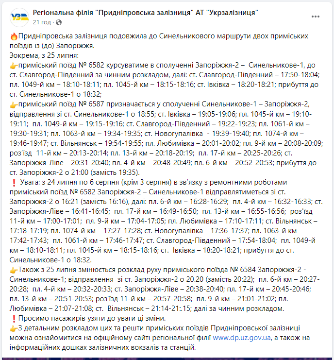 Крім того, з 24 липня до 6 серпня (крім 3 серпня) в зв’язку з ремонтними роботами приміський поїзд № 6582 Запоріжжя-2 – Синельникове-1 відправлятиметься зі ст. Запоріжжя-2 о 16:21 (замість 16:16), прибуття до ст. Синельникове-1 о 18:32.