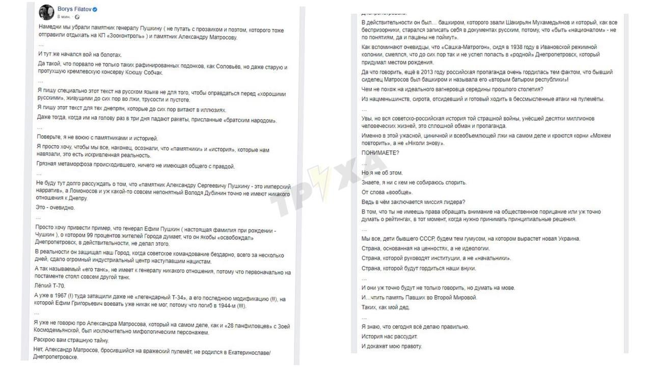 Філатов про демонтаж пам'ятників у Дніпрі: Матросов насправді був башкиром, а танк не належить Юхиму Пушкіну