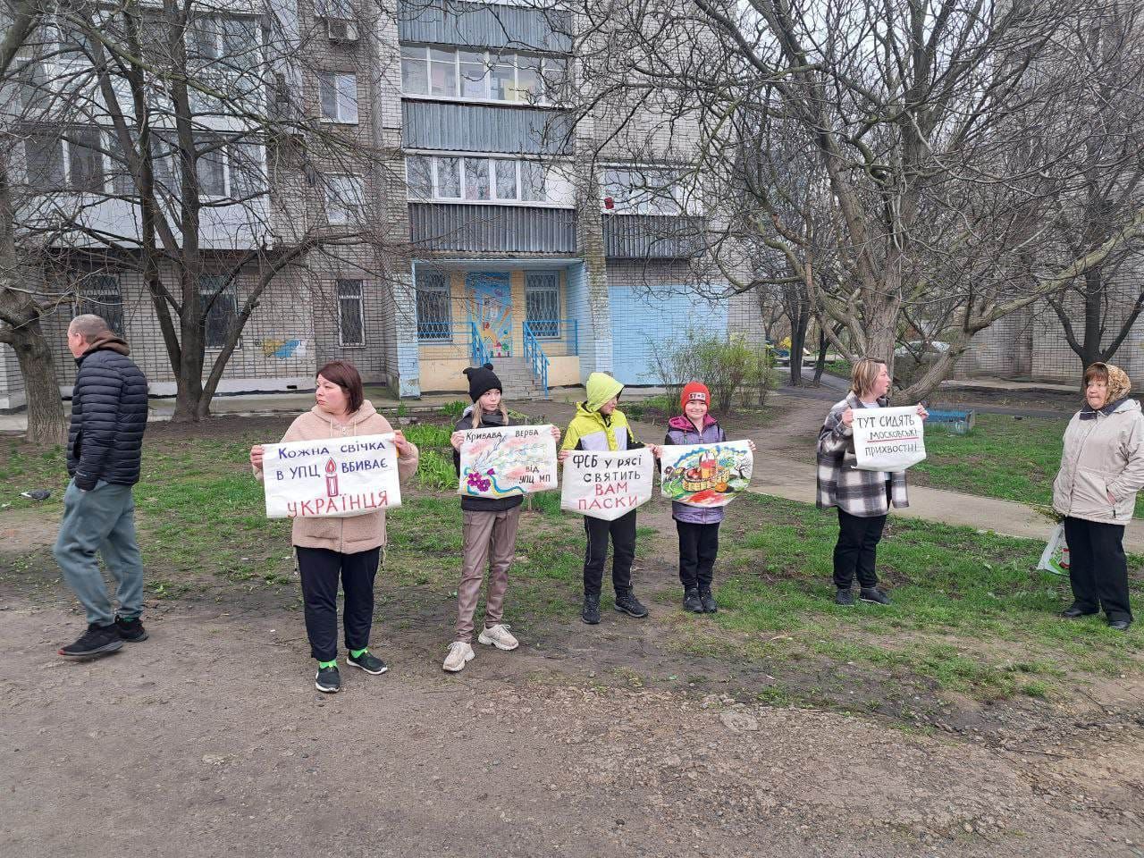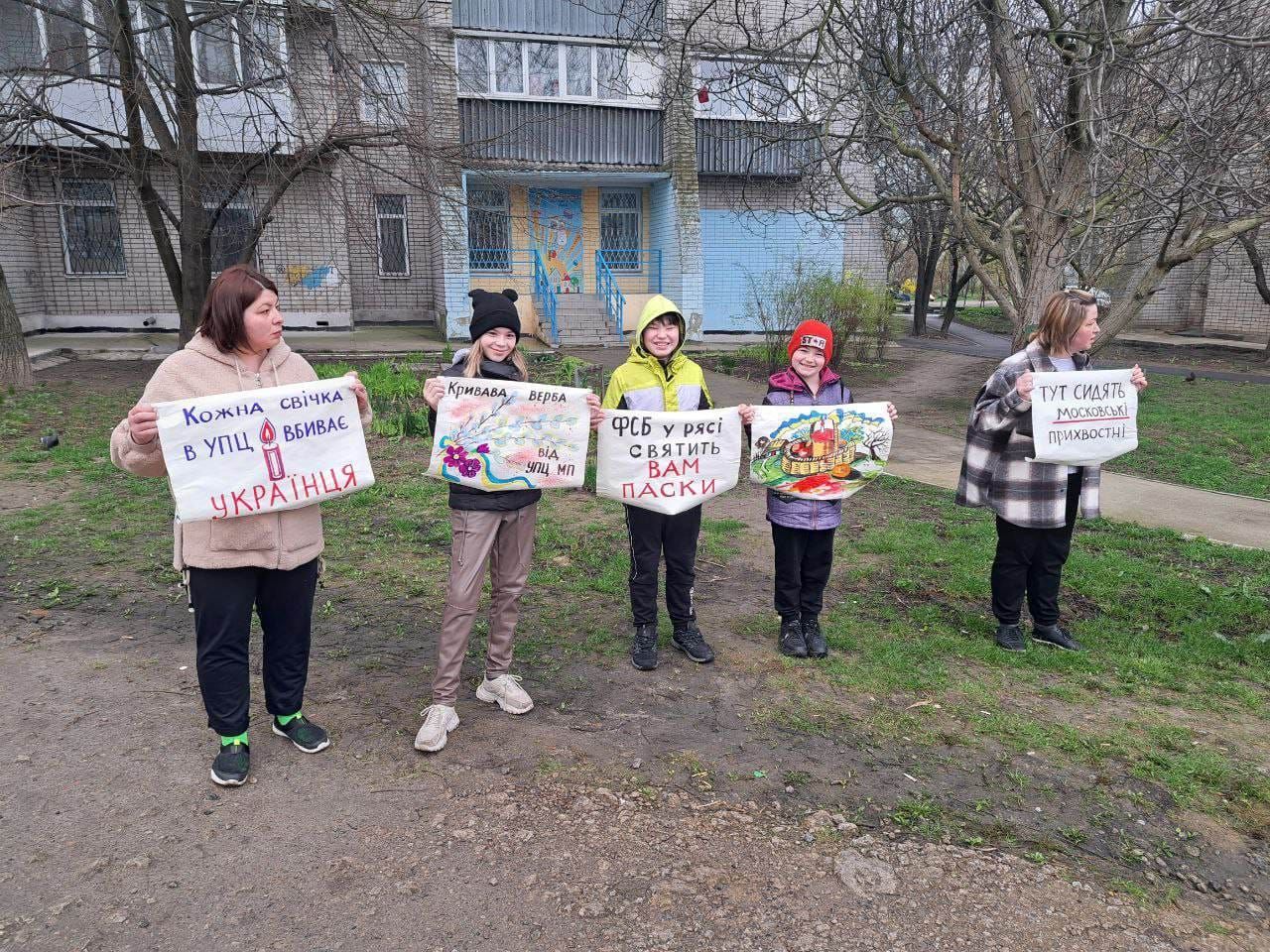 "Кожна свічка в УПЦ вбиває українця", "Кривава верба від УПЦ МП", "Тут сидять московські прихвосні" - було написано на плакатах.