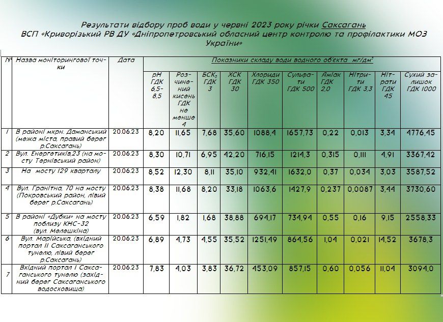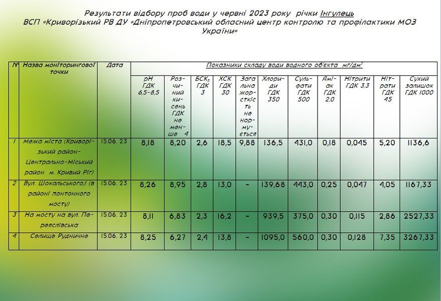 Фахівці стверджують, що у річках Інгулець та Саксагань перевищені гранично-допустимі концентрації за хімічними показниками. А саме сухий залишок, хлориди, сульфати. Також є значні відхилення за санітарно-мікробіологічними характеристиками. Інші концентрації забруднюючих речовин наразі в межах допустимих норм.