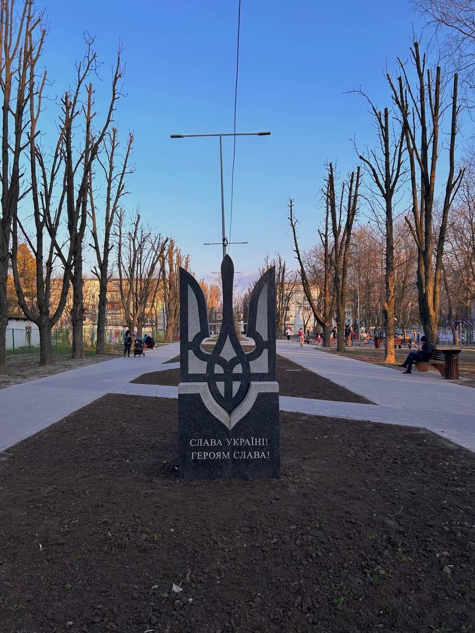 На фото видно, що в сквері привели до ладу алейки, підрізали дерева, поставили лавочки та величезний тризуб з патріотичним написом.