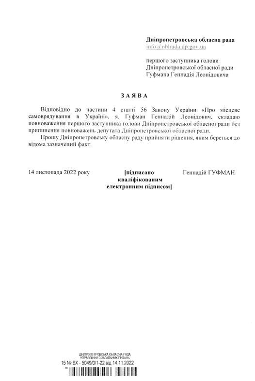 Перший заступник голови Дніпропетровської обласної ради Геннадій Гуфман подав заяву із проханням звільнити його з посади.