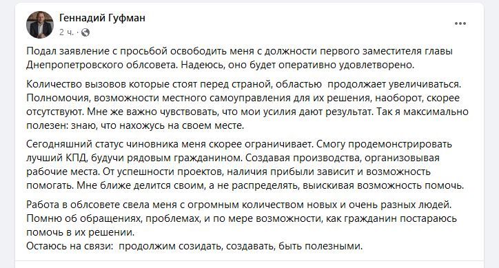 Перший заступник голови Дніпропетровської облради Гуфман повідомив, що йде з посади.